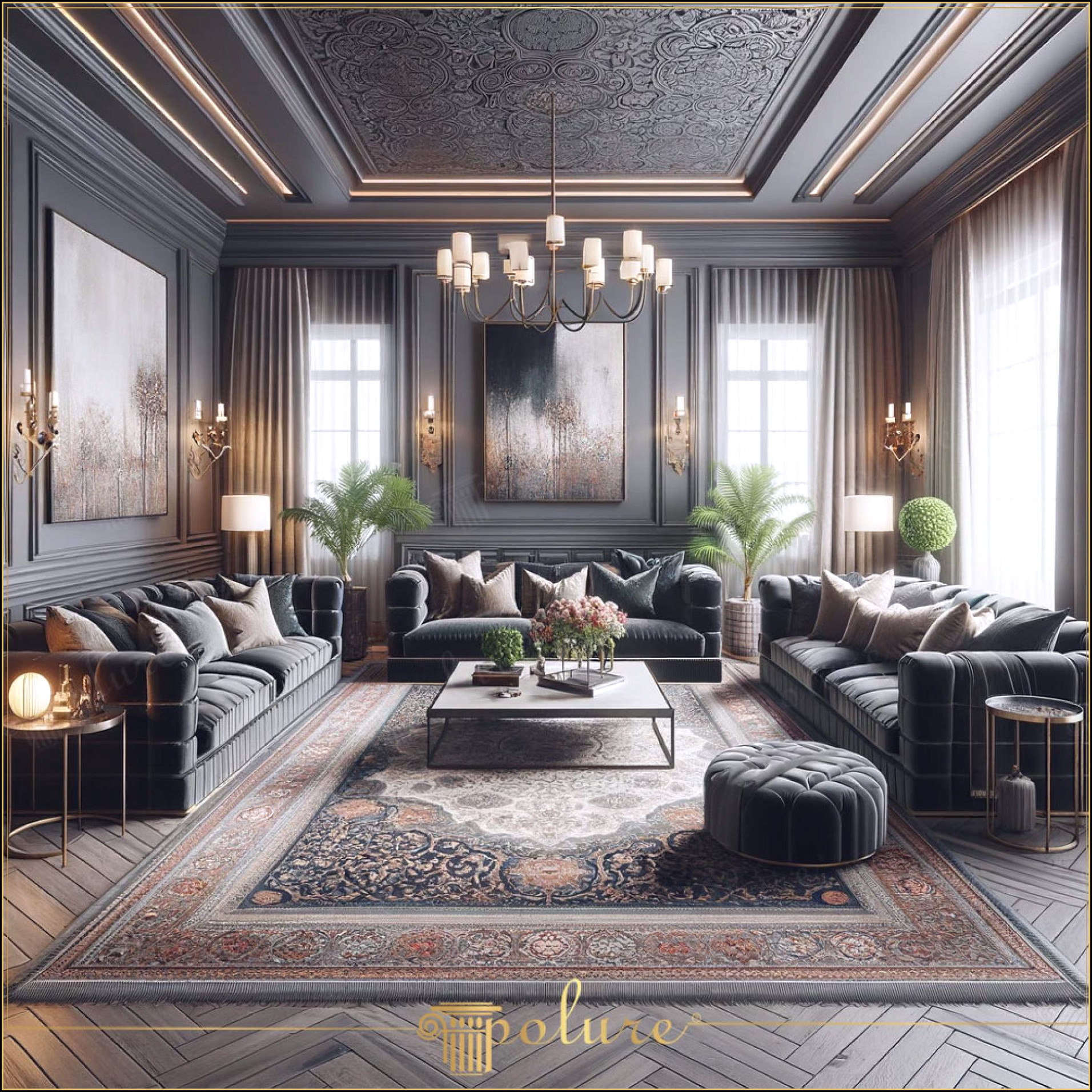 Iată un design de lux pentru living. Acest design are ferestre mari arcuite, muluri elegante și tavane înalte. Camera are o lumină naturală mare